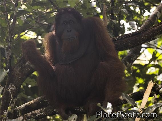 The Bornean orangutan is an orangutan species endemic to the island of Borneo. It belongs to the only genus of great apes native to Asia and is the largest of the three Pongo species. It has a coarse, reddish coat and up to 1.5 m long arms. It is sexually dimorphic — males are larger than females and develop large cheek pads (flanges), for example.