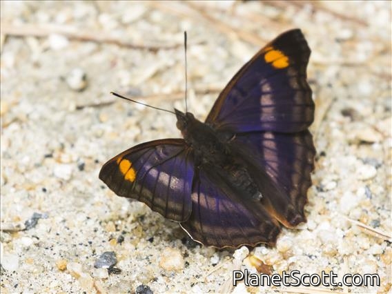 Doxocopa pavon, the Pavon emperor or Pavon, is a species of butterfly in the family Nymphalidae. They can be found from Paraguay in South America up to Texas in the southern United States. They are generally brown in their overall coloration, with two bands of white straddling the middle of the upper surfaces of the wings, and a patch of orange on the tips of their forewings. The upper surfaces of the wings of the males are overlaid by an iridescent blue-purple sheen. The females of the species closely resemble members of the unrelated genus Adelpha.