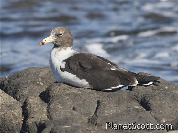 Belcher's gull, also known as the band-tailed gull, is a bird in the family Laridae found along the Pacific coast of South America. It formerly included the very similar Olrog's gull as a subspecies, but that bird occurs on the Atlantic coast of South America and is now accepted as Larus atlanticus. Belcher's gull is a medium-sized gull with a blackish mantle, white head and underparts, a black band on the otherwise white tail, and a yellow bill with a red and black tip. Non-breeding adults have a brownish-black head and a white eye-ring. The name of this bird commemorates the British explorer Sir Edward Belcher, who performed survey work on the Pacific coast of South America.
