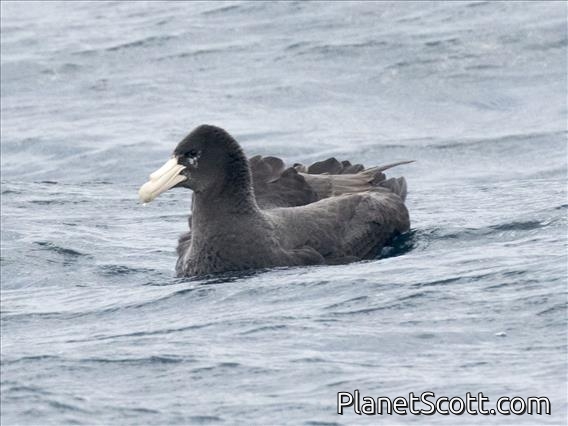 The southern giant petrel, also known as the Antarctic giant petrel, giant fulmar, stinker, and stinkpot, is a large seabird of the southern oceans. Its distribution overlaps broadly with the similar northern giant petrel, though it overall is centered slightly further south. Adults of the two species can be distinguished by the colour of their bill-tip: greenish in the southern and reddish in the northern.