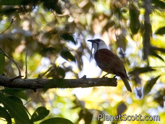 The three-wattled bellbird is a Central American migratory bird of the cotinga family. The sexes are very dissimilar in appearance. The male has a white head and throat and the remaining plumage is chestnut brown. From the base of his beak dangle three long, slender, black wattles that he uses in display. The female has olive plumage with yellowish streaked underparts and a yellow vent area.