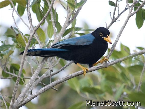The Yucatan jay is a species of bird in the family Corvidae, the crows and their allies. It is native to the Yucatán Peninsula where its habitats are subtropical or tropical dry forest, plantations and cleared areas at altitudes up to 250 m (820 ft). Adults are about 30 cm (12 in) long, black, with blue wings, mantle, and tail, black bills, yellow eye rings and legs. Immature birds have yellow bills. This is a common species of jay with a wide range and the International Union for Conservation of Nature has rated its conservation status as being of "least concern".