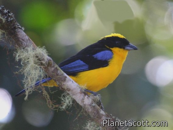 The blue-winged mountain tanager is a species of bird in the family Thraupidae, the tanagers. It is found in highland forest and woodland in the Andes of Bolivia, Colombia, Ecuador, Peru and Venezuela, as well as a disjunct population in the Venezuelan Coastal Range. It is a common species and its populations appear to be stable. It is generally bright yellow and black with blue to the wings and tail; some populations have a moss-green back. In Bolivia and southernmost Peru, the rump is blue and the voice is very different; this population is sometimes recognized as a separate species, the Bolivian mountain tanager.
