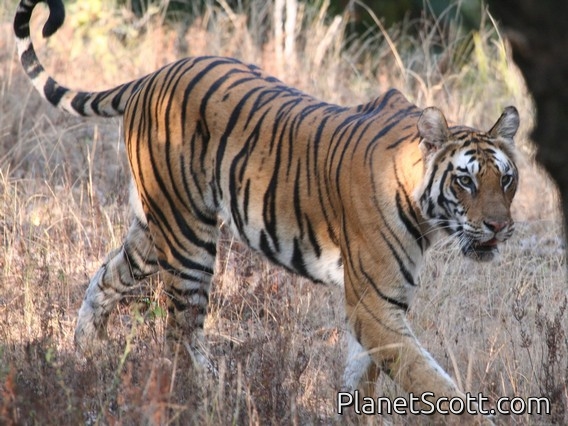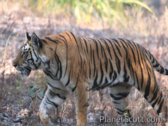Bandhavgarh National Pak, IndiaThe driver saw the tiger, and positioned us where he thought it would come out of the woods. Minutes later, the tiger emerged from the underbrush and walked directly in front of the open topped truck while I took several photos. The forest was alive with alarm calls that followed the tiger as he walked.×× -