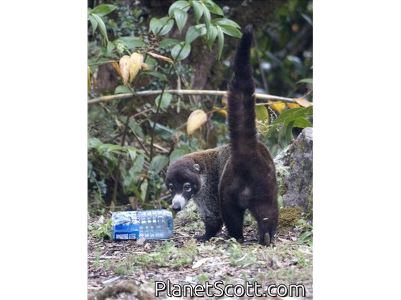 The white-nosed coati, also known as the coatimundi, is a species of coati and a member of the family Procyonidae. Local Spanish names for the species include antoon, gato solo, pizote, and tejón, depending upon the region. It weighs about 4–6 kg (8.8–13.2 lb), and the nose-to-tail length of the species is about 110 cm (3.6 ft) with about half of that being the tail length. However, small females can weigh as little as 3.1 kg (6.8 lb), while large males can weigh as much as 9 kg (20 lb).