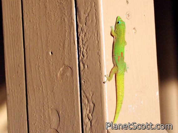 The gold dust day gecko is a diurnal species of gecko. It lives in northern Madagascar, the Comoro Islands, and the Mascarene Islands; it has also been introduced to Hawaii and other Pacific islands. It is primarily an arboreal species which can be found in tropical forests and may also associate with human dwellings. The gold dust day gecko feeds on insects and nectar.