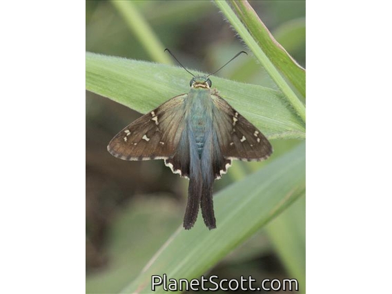 The long-tailed skipper is a spread-winged skipper butterfly found throughout tropical and subtropical South America, south to Argentina and north into the eastern United States and southern Ontario. It cannot live in areas with prolonged frost. It is a showy butterfly, with wings of light brown tinted with iridescent blue, and two long tails extending from the hindwings. The robust body is light blue dorsally. It has a large head, prominent eyes, and a wingspan between 4.5 and 6 centimeters.