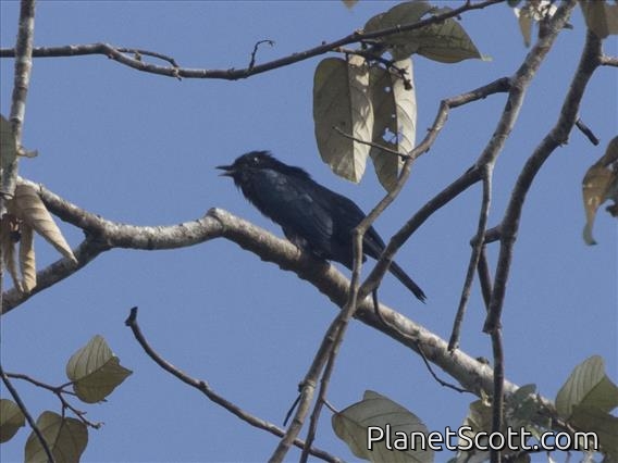 The square-tailed drongo-cuckoo is a species of cuckoo that resembles a black drongo. It is found along the Himalayas extending east into Southeast Asia. The calls are series of piercing sharp whistles rising in pitch but shrill and choppily delivered. In the past, the species S. lugubris also included the subspecies dicruroides, which is now treated as a separate species, the fork-tailed drongo-cuckoo.