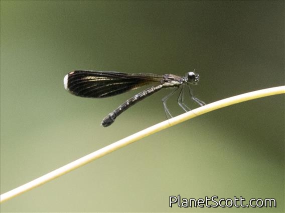 It is a medium-sized damselfly with a short stout body, it is black with blue markings, and has long dark wings with pterostigma.