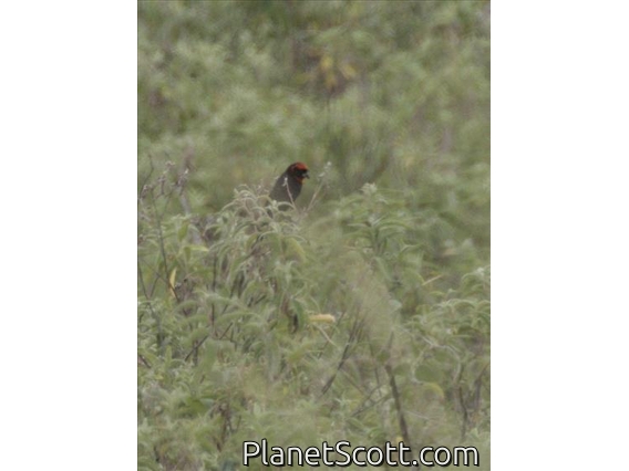 The red-cowled widowbird is a species of bird in the weaver family Ploceidae. Red-cowled widowbirds are found in grasslands and bush clearings in East Africa. They are known for their long tails and brilliant red badges, both which act as sexual ornaments. They are often associated with other widowbird and bishop species. They are polygynous, where males acquisition of territory is an important determinant in their access to mates. Red-cowled widowbirds have a wide range and there is little concern in terms of conservation status.