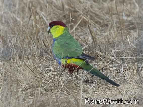 The red-capped parrot is a species of broad-tailed parrot native to southwestern Australia. It was described by Heinrich Kuhl in 1820, with no subspecies recognised. It has long been classified in its own genus owing to its distinctive elongated beak, though genetic analysis shows that it lies within the lineage of the Psephotellus parrots and that its closest relative is the mulga parrot. Not easily confused with other parrot species, it has a bright crimson crown, green-yellow cheeks, and a distinctive long bill. The wings, back, and long tail are dark green, and the underparts are purple-blue. The adult female is very similar though sometimes slightly duller than the male; her key distinguishing feature is a white stripe on the wing under-surface. Juveniles are predominantly green.