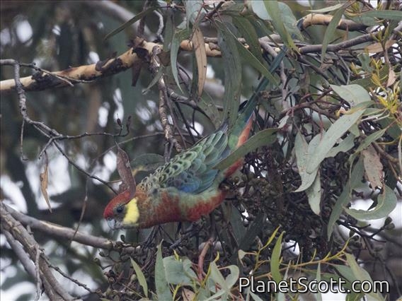 The western rosella, or moyadong, is a species of parrot endemic to southwestern Australia. The head and underparts are bright red, and the back is mottled black; a yellow patch at the cheek distinguishes it from others of the genus Platycercus. Adults of the species exhibit sexual dimorphism with the females duller overall; juveniles lack the striking colours of mature birds and the characteristic patterning is not as easily distinguished. Their communication call is a softly delivered pink-pink sound, and much of their behaviour is comparatively unobtrusive. Their habitat is in eucalypt forests and woodlands, where they often remain unobserved until they appear to feed on seeds at nearby cleared areas.