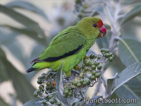 The black-winged lovebird also known as Abyssinian lovebird is a mainly green bird of the parrot family. At about 16.5 cm (6.5 inches) long, it is the largest of the lovebird genus, a group of small parrots. The adult male is easily identified by its red forehead, and the adult female by its all-green head. They are native to Eritrea and Ethiopia, and they are uncommon as pets.