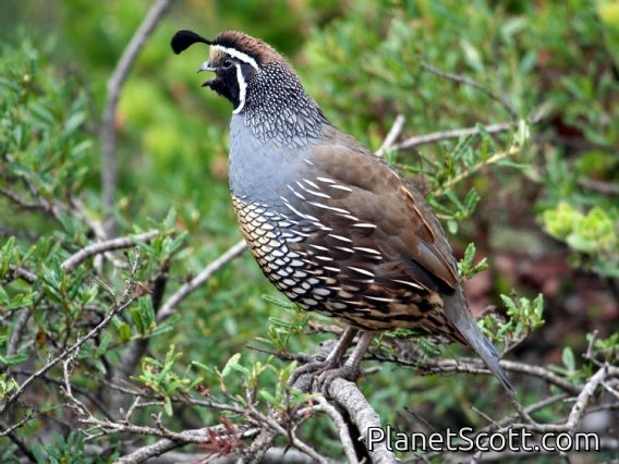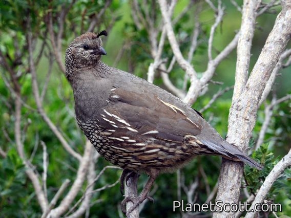 The California quail, also known as the California valley quail or Valley quail, is a small ground-dwelling bird in the New World quail family. These birds have a curving crest, plume or topknot made of six feathers, that droops forward: black in males and brown in females; the flanks are brown with white streaks. Males have a dark brown cap and a black face with a brown back, a grey-blue chest and a light brown belly. Females and immature birds are mainly grey-brown with a light-colored belly.