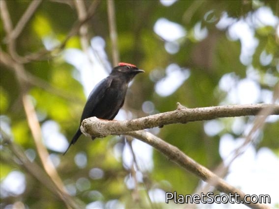 The lance-tailed manakin is a small passerine bird which breeds in tropical Central and South America from Costa Rica to northern Venezuela. This manakin is a fairly common bird of dry and moist deciduous forests, but not rainforest. It is a small, compact bird about 13 centimetres (5 in) long and similar to the blue-backed manakin, but both sexes have the two central tail feathers elongated to form a spike. Males have black plumage with a blue back, a red crown and orange legs. Females and juveniles are olive-green with paler underparts. At breeding time, males are involved in a cooperative behaviour during which they jump up and down alternately. This is a fairly common species with a wide range, and the International Union for Conservation of Nature has rated its conservation status as being of "least concern".