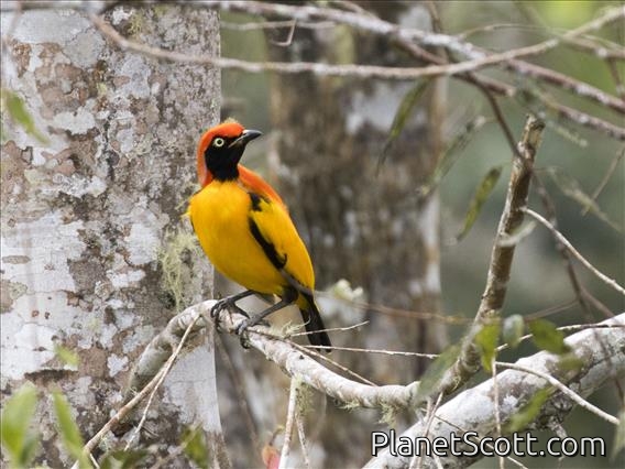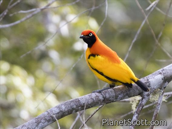The masked bowerbird is endemic to rainforests of New Guinea. It is one of the most brilliantly coloured bowerbirds. The male is a medium-sized bird, up to 25cm long, with flame orange and golden yellow plumage, elongated neck plumes and yellow-tipped black tail. It builds an "avenue-type" bower with two side walls of sticks. The female is an olive brown bird with yellow or golden below.