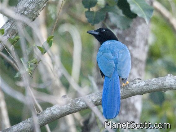 The Yucatan jay is a species of bird in the family Corvidae, the crows and their allies. It is native to the Yucatán Peninsula where its habitats are subtropical or tropical dry forest, plantations and cleared areas at altitudes up to 250 m (820 ft). Adults are about 30 cm (12 in) long, black, with blue wings, mantle, and tail, black bills, yellow eye rings and legs. Immature birds have yellow bills. This is a common species of jay with a wide range and the International Union for Conservation of Nature has rated its conservation status as being of "least concern".