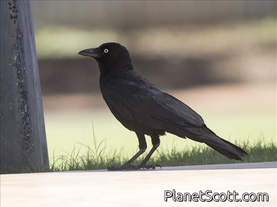 The little crow is an Australian species of crow, very similar to the Torresian crow in having white bases to the neck and head feathers but slightly smaller and with a slightly smaller bill. It has the same white iris that distinguish the Australian species from all other Corvus except a few island species to the north of Australia. The western jackdaw shares that trait, but while formerly considered members of Corvus the jackdaws are now commonly put into their own genus Coloeus. Like the Australian raven, the little crow has a blue ring around the pupil.