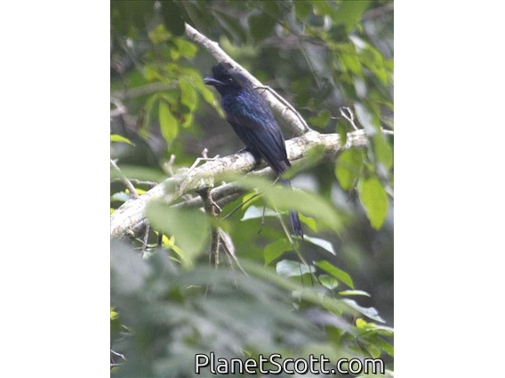 The greater racket-tailed drongo is a medium-sized Asian bird which is distinctive in having elongated outer tail feathers with webbing restricted to the tips. They are placed along with other drongos in the family Dicruridae. They are conspicuous in the forest habitats often perching in the open and by attracting attention with a wide range of loud calls that include perfect imitations of many other birds. One hypothesis suggested is that these vocal imitations may help in the formation of mixed-species foraging flocks, a feature seen in forest bird communities where many insect feeders forage together. These drongos will sometimes steal insect prey caught or disturbed by other foragers in the flock and another idea is that vocal mimicry helps them in diverting the attention of smaller birds to aid their piracy. They are diurnal but are active well before dawn and late at dusk. Owing to their widespread distribution and distinctive regional variation, they have become iconic examples of speciation by isolation and genetic drift.