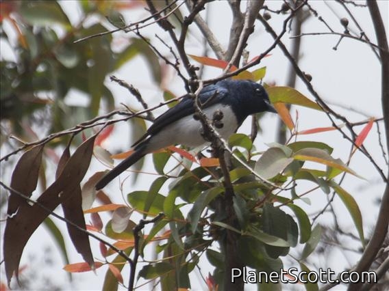 The satin flycatcher is a species of bird in the family Monarchidae. Males stand out with their blue-black feathers contrasting their white bellies, and the females with their bright orange throats. It breeds mostly in south-eastern Tasmania and Australia. It is declining throughout the eastern seaboard due to predation from the introduced Red Fox and habitat loss. It is a vagrant to New Zealand.