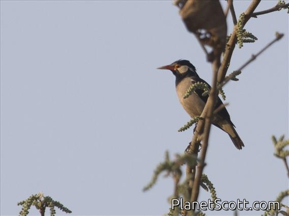 The Indian pied myna is a species of starling found in the Indian subcontinent. It is usually found in small groups mainly on the plains and low foothills. It is often seen within cities and villages although it is not as bold as the common myna. It produces a range of calls made up of liquid notes.