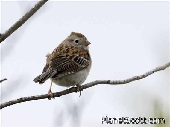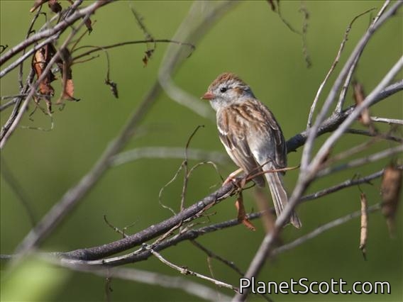 The field sparrow is a small New World sparrow in the family Passerellidae. It is about 140 mm (6 in) long and weighs about 12.5 g (0.4 oz). The head is grey with a rust-coloured crown, white eye-ring and pink bill. The upper parts are brown streaked with black and buff, the breast is buff, the belly is white and the tail is forked. There are two different colour morphs, one being greyer and the other more rufous.